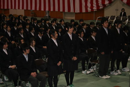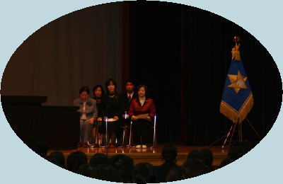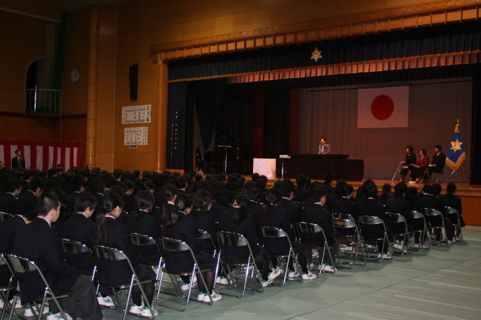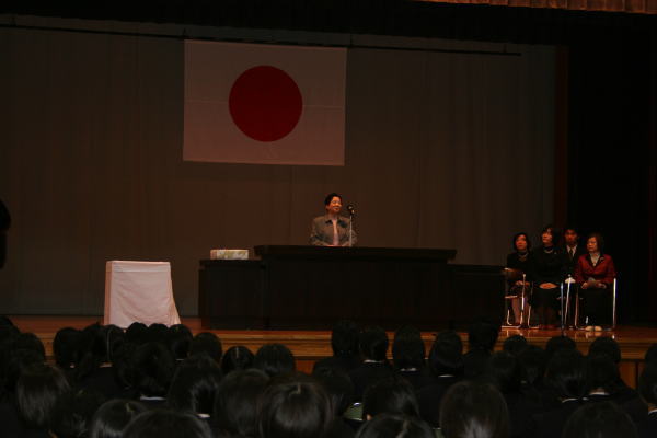 | □ 平成20年度 入会式 平成21年3月4日(水) 12:00 富山いずみ高校 第一体育館 卒業式を明日に控え、準備の整った第一体育館で、村山千栄子清泉同窓会副会長をはじめ 富山いずみ高校卒業生の常任理事ら代表役員5名が出席して入会式が行われました。 神田 浩学校長、先生方全員のご出席のもと、平成20年度卒業生191名が 清泉同窓会に入会されました。 今日入会された総合学科153名、看護科38名の皆さんは、平成18年4月に入学された 富山いずみ高校 第5回入学生(第7回卒業生)です。 中尾淳子会長に代わって宮尾次子副会長から「明日いよいよご卒業なさる皆さんを同窓会に お迎えできることを心からうれしく思います。 清泉同窓会は、富山県立富山高等女学校、富山県立富山女子高校と富山県立富山いずみ 高校の3つの学校の卒業生の同窓会です。 清泉同窓会は今年、設立50周年を迎える歴史と伝統のある同窓会です。 皆さんは明日、この学び舎を巣立っていかれるわけですが、これから皆さんが歩んでいかれる 道は決して平坦な道ばかりではないかもしれません。時々学校を思い出して誇りをもって 歩んでいっていただきたいと思います。」との餞(はなむけ)の言葉が贈られました。 また、5月の総会に出席していただきたいことや秋には研修旅行を実施していること、 「清泉同窓会の公式ホームページ」が開設されていて母校の様子をどこからでも見ることが できることなど清泉同窓会の活動紹介がありました。 |