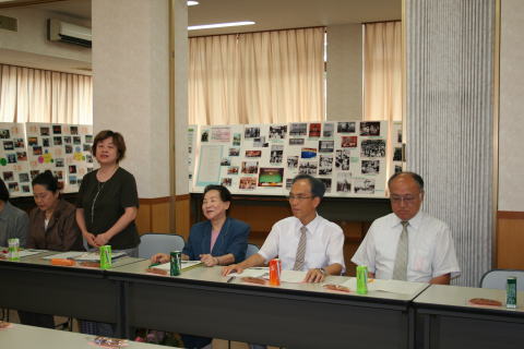 | 森美弥子会長に代わって廣瀬副会長がごあいさつ 背景に展示してあるのは、生徒さんが制作した「110年のあゆみ」 式典会場に展示されていました |