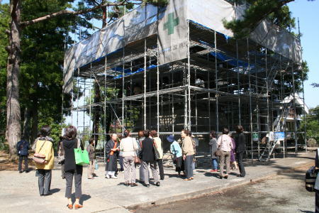 重厚な彫刻が施された鐘楼は屋根を改修中 |